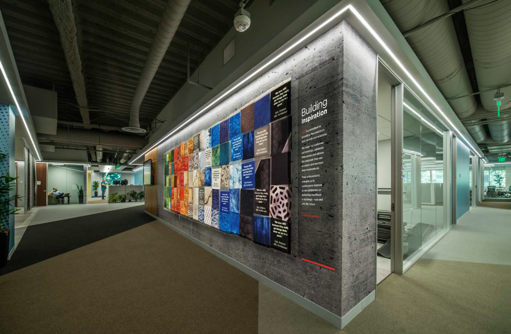 Over 30-feet in width, and custom-built to hold over 700 lbs., the main attraction of the Building Inspiration wall is a 5’ by 18’ sculpture. The wall is made up of 90 titles that feature customer quotes, materials used in the construction of buildings, and images of people who represent our customers.